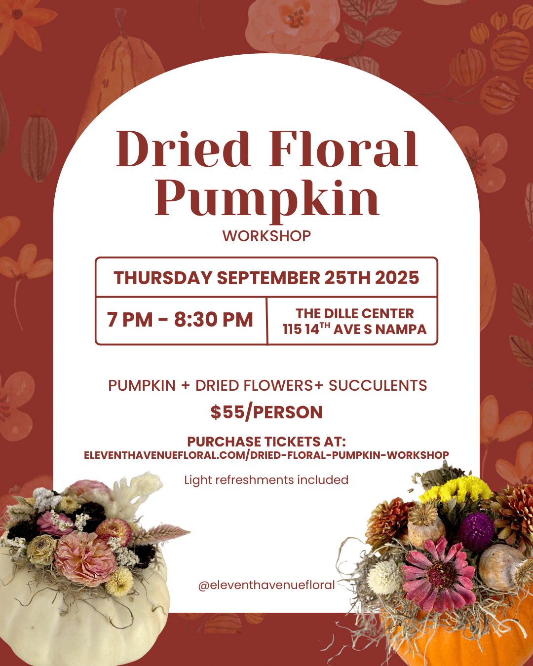 Come embrace the fall season with a cozy hands-on workshop where we’ll decorate real pumpkins with dried flowers from my farm + real succulents. You’ll create a stunning centerpiece that will last all season (and make your fall table so Pinterest-worthy). Spots are limited! No experience required. $55/person.